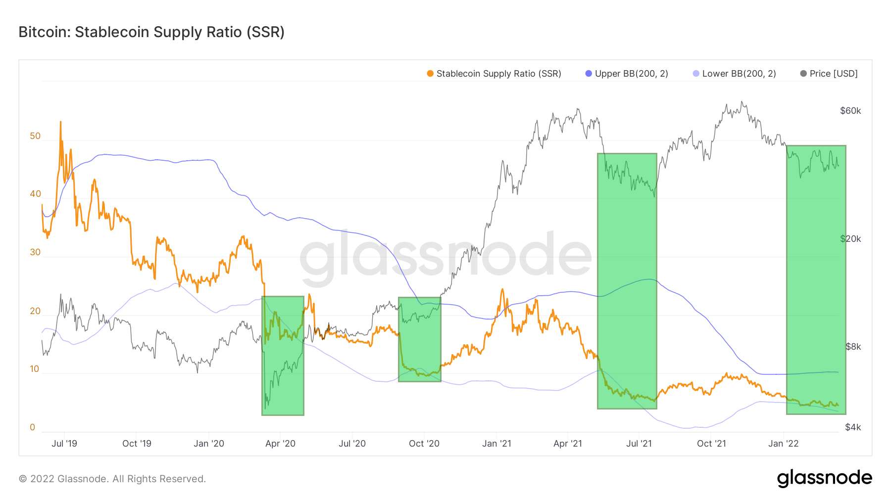 Podobnego sygnału dostarcza podstawowy wykres SSR, o który pisaliśmy w BeInCrypto już w grudniu 2021 r. Od ponad dwóch miesięcy wykres SSR konsoliduje się przy dolnej 200-dniowej wstędze Bollingera. Historycznie obszar ten był okresem dobrych okazji zakupowych, po których cena Bitcoina i altcoinów dynamicznie rosła (zielone obszary).