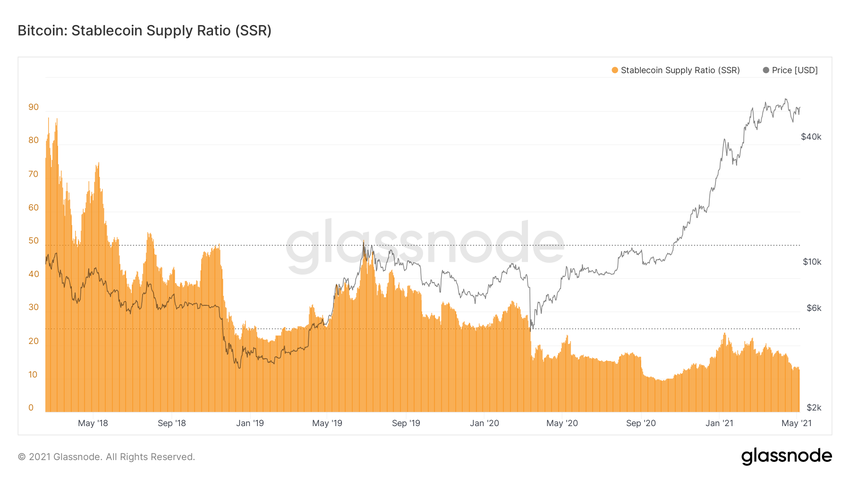 Pomimo ciągłego wzrostu ceny BTC, SSR znacznie spadła. Oznacza to, że stablecoiny mają znaczną siłę nabywczą.