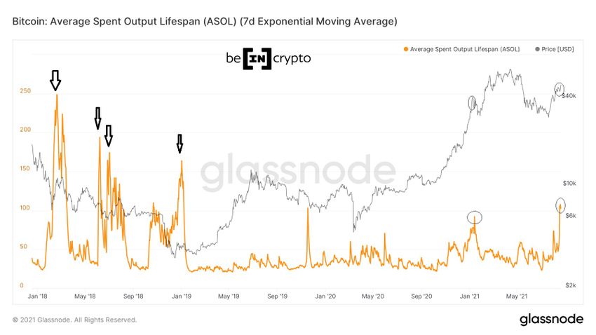 ASOL mierzy średni wiek każdej wydanej transakcji, nie biorąc pod uwagę wolumenu. Oznacza to, że transakcje o wartości 1 BTC i 100 BTC, które były wcześniej uśpione przez taką samą liczbę dni, będą miały taki sam odczyt ASOL. To odróżnia go od CDD, który uwzględnia wolumen.