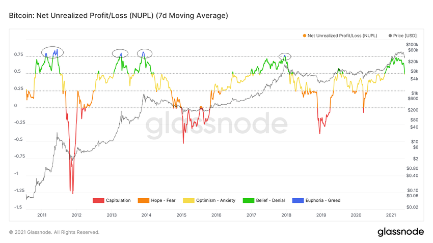 W październiku 2020 roku NUPL po raz pierwszy przekroczył 0,5. Korekta z zeszłego tygodnia sprowadził go teraz z powrotem poniżej 0,5. Możliwe, że w tym cyklu wydarzy się to samo, co w 2017 roku, gdzie NUPL dokonał weryfikacji tego poziomu i ruszył w górę.
