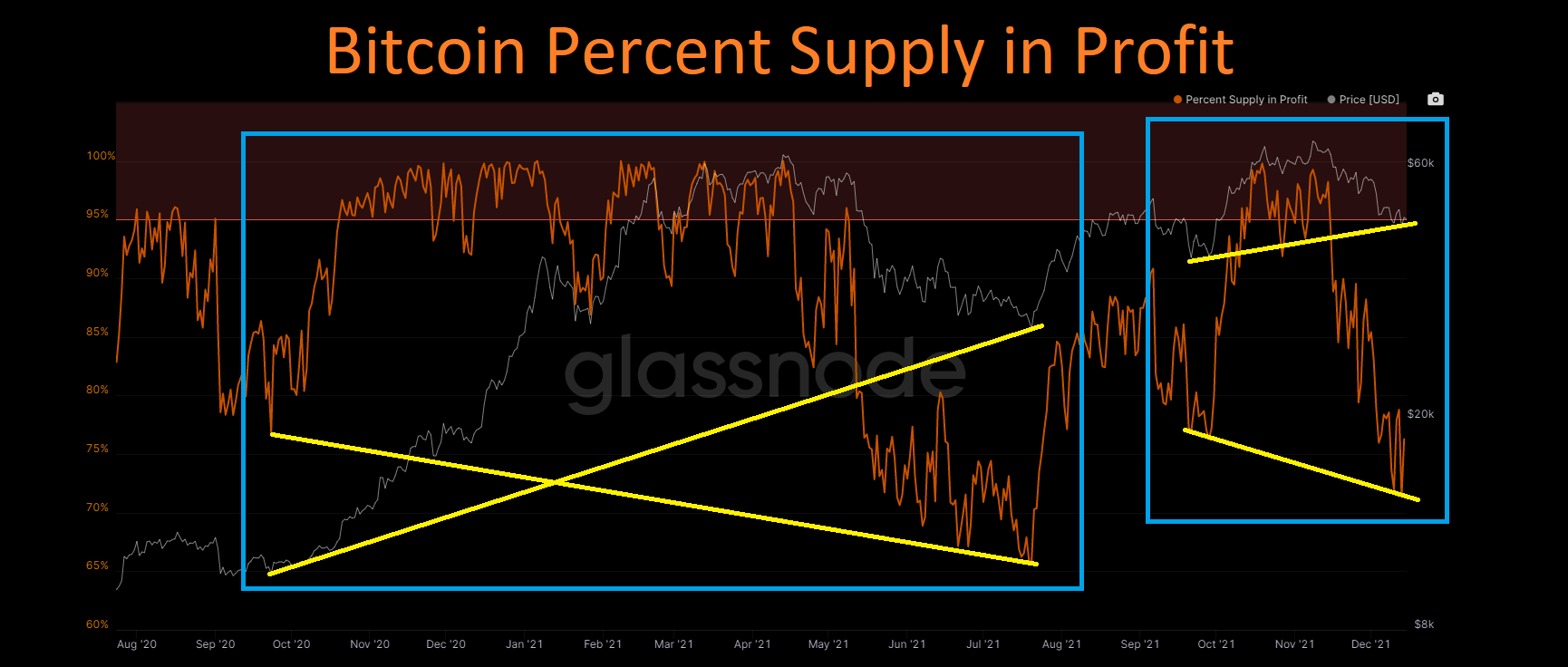 Licząc od rekordu wszech czasów na 69 000 USD do bieżącej ceny Bitcoina wskaźnik ten odnotował około 25% spadek. Intensywność tego spadku można porównać do majowego krachu. Procentowa wartość podmiotów w zysku już prawie osiągnęła dołek z końcówki letniej korekty na BTC (przerywana linia).