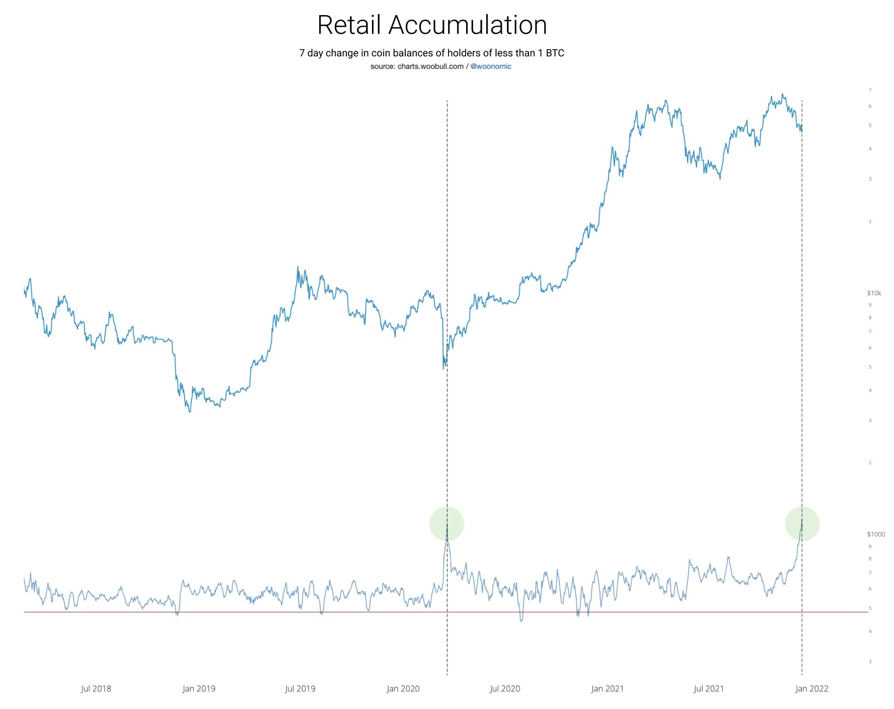 Jednak w opozycji do tego twierdzenia znany analityk on-chain @woonomic opublikował na Twitterze inny wykres. Zdaje się on zaprzeczać wcześniejszym intuicjom na temat biernej roli indywidulanych inwestorów. Jego zdaniem: