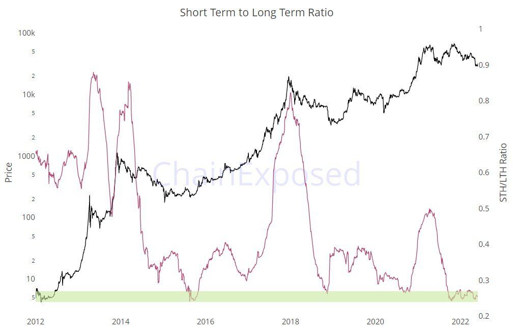 W poprzednich rynkach niedźwiedzia z lat 2014-2015 i 2018 oraz krachu w 2020 roku osiągnięcie zielonego obszaru wiązało się z procesem osiągania dołka przez BTC. Zielony obszar zawiera się w zakresie 0,25-0,28 i wskazuje na sytuację, w której większość podaży Bitcoina (ponad 70%) pozostaje w rękach długoterminowych hodlerów.