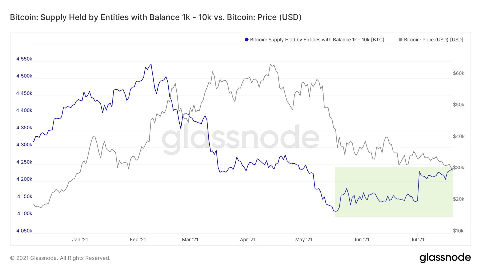 Zatem w generalnym ujęciu analiza on-chain zwraca uwagę na długoterminowy trend przepływu Bitcoinów od wielorybów do płotek, który nie zatrzymał się w trakcie bieżących spadków. Istnieje jednak gatunek wieloryba, żyjący w rejonie 1-10k BTC, który również agresywnie zwiększa swoje zasoby w trakcie ostatnich 3 tygodni.