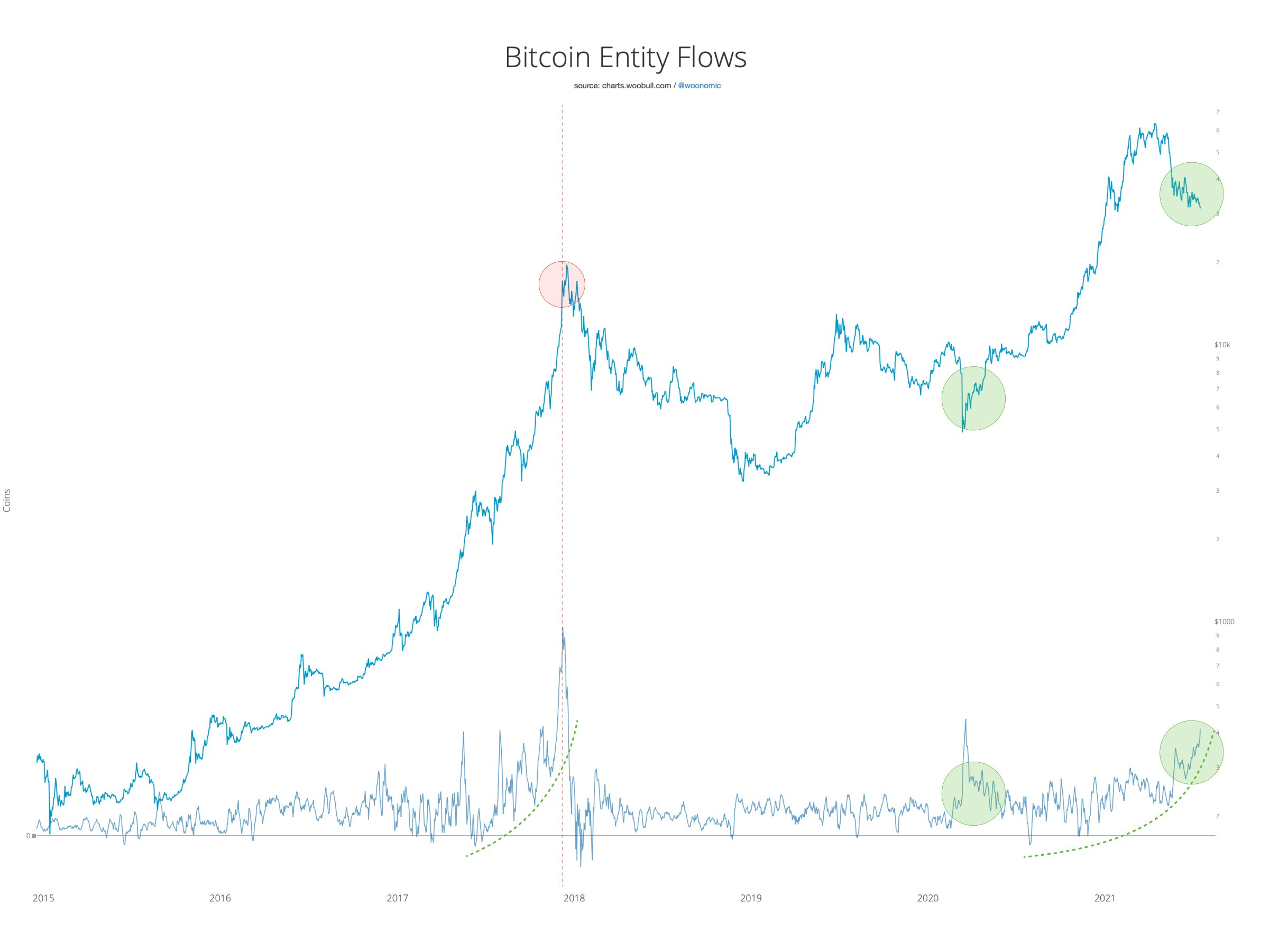 Powodem, dla którego Woo zwraca szczególną uwagę na zachowanie małych inwestorów jest historyczna korelacja pomiędzy okresowym wzrostem liczby niewielkich hodlerów BTC a wzrostem ceny Bitcoina. Analityk obrazuje to na wykresie tygodniowego przepływu netto dla graczy posiadających mniej niż 1 BTC.