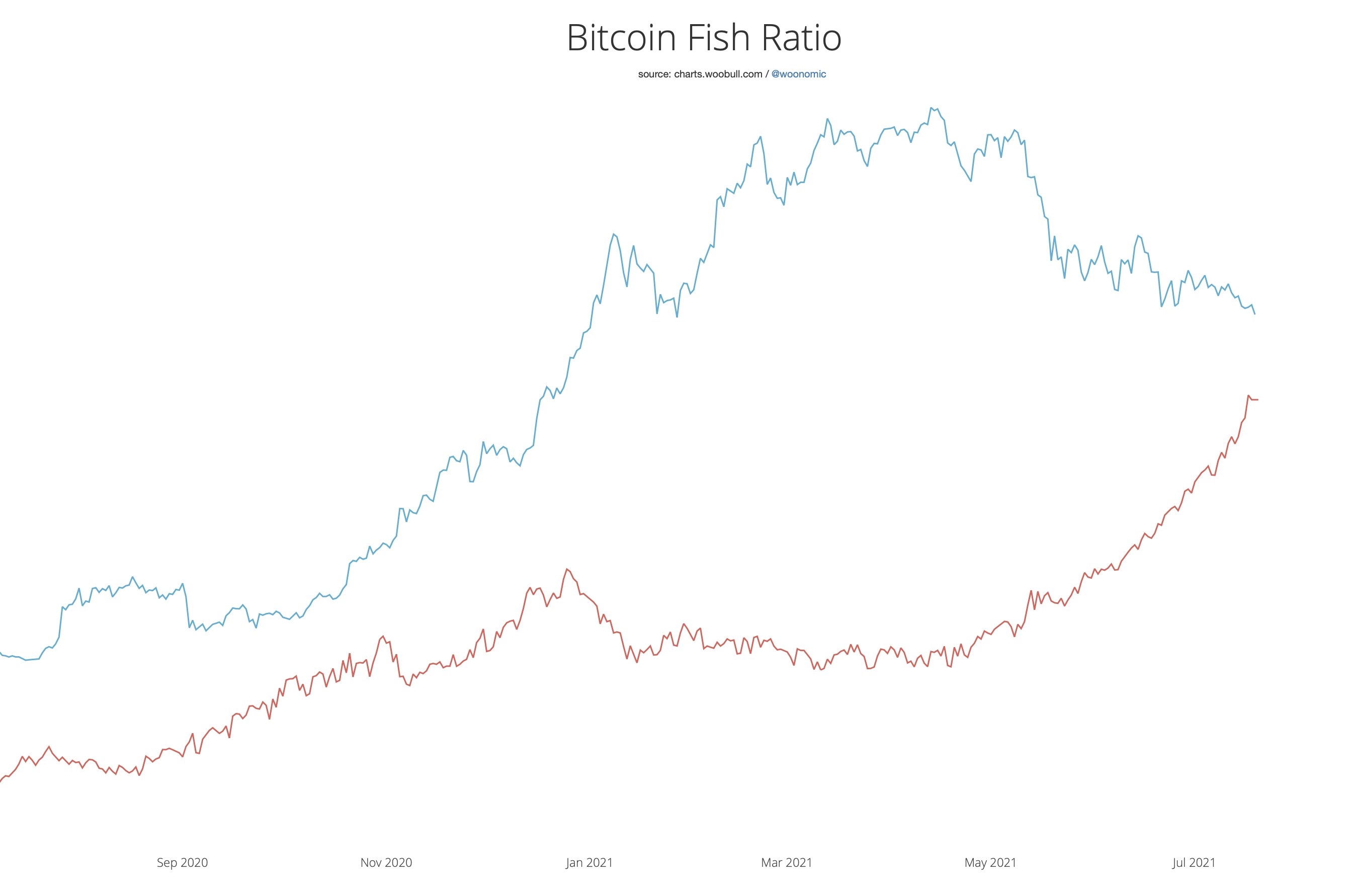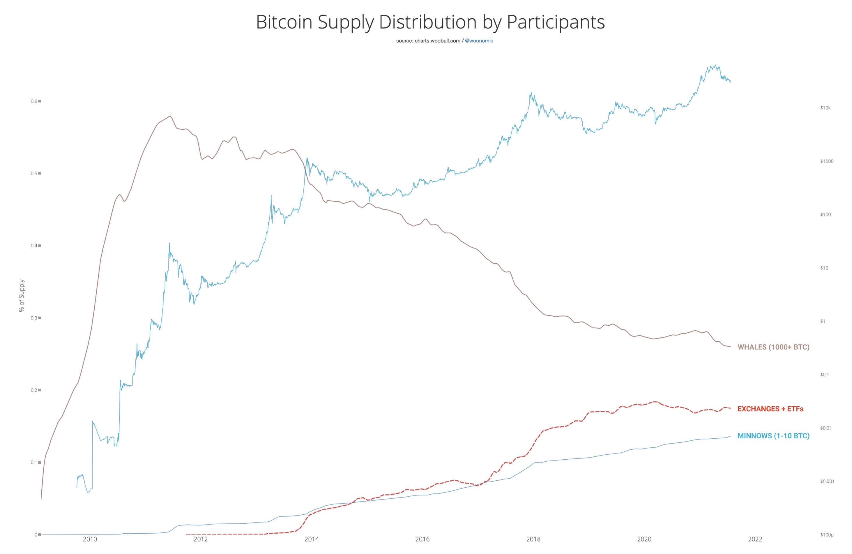 Woo zwraca uwagę, że „monety przechodzą do mas”. Według jego analizy on-chain dominacja płotek zwiększa się. Jeżeli wziąć też pod uwagę podaż w rękach giełd i ETFów, których zasoby w dużej mierze reprezentują udziały mniejszych graczy, to wieloryby tracą prymat pierwszeństwa.