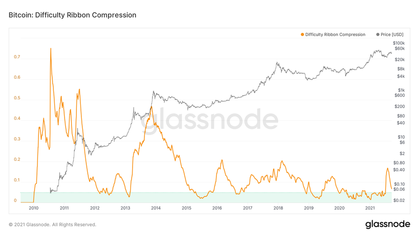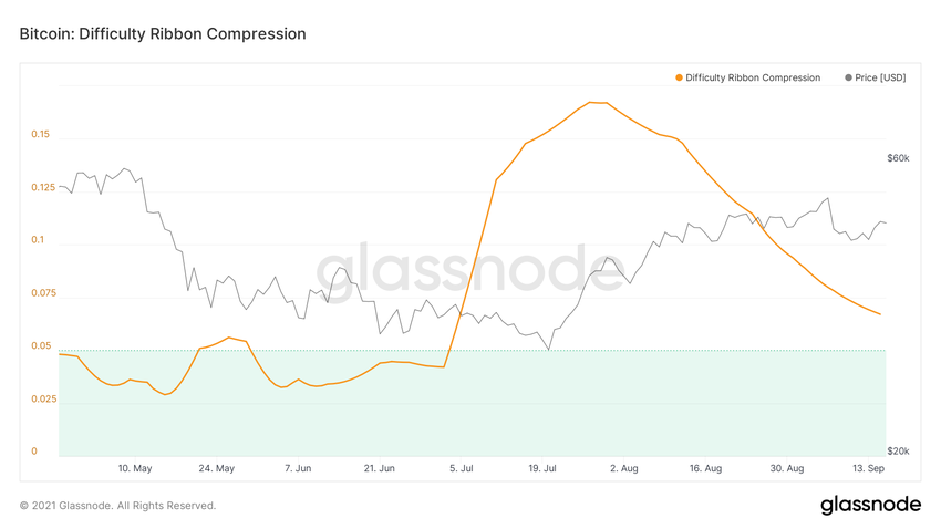Średnie kroczące (MA) Hash Ribbon utworzyły byczy krzyż, potencjalnie sugerując, że okres kapitulacji górników dobiegł końca. Difficulty Ribbon Compression przesunął się powyżej 0.05, co dodatkowo potwierdza tę możliwość.