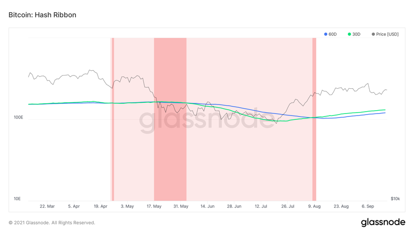 Hash ribbon korzysta z hash rate, aby określić, czy górnicy są w trakcie kapitulacji. Za kapitulację górników uważa się okres, w którym koszty wydobycia są wyższe niż nagrody. Na poniższym wykresie są one oznaczone kolorami jasno i ciemnoczerwonym.