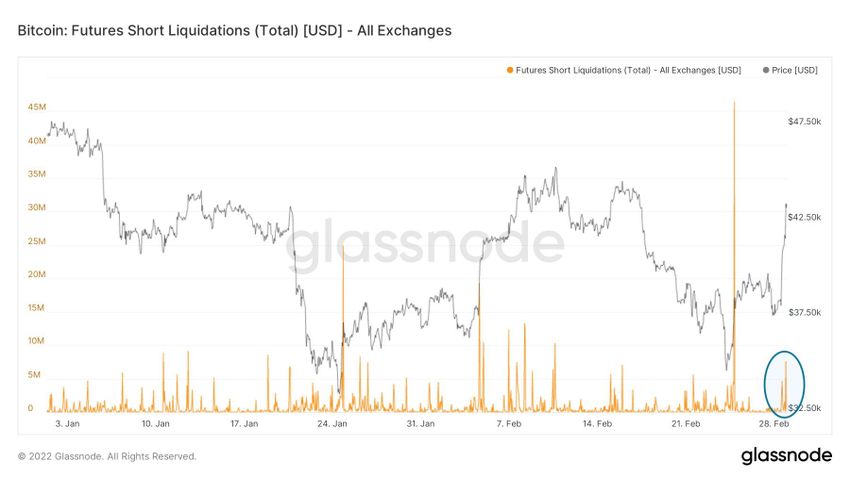 Analityk on-chain @mskvsk zamieścił na Twitterze wykres, który pokazuje niewielką ilość likwidacji krótkich pozycji BTC. Wskazuje to, że obecny wzrost cen nie wynika z rynku kontraktów terminowych.