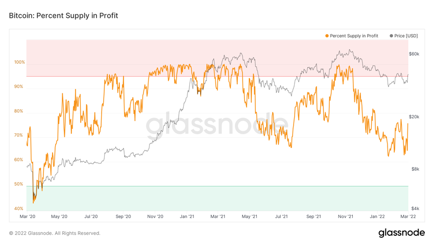 Spojrzenie na wskaźniki procentowe podaży w zysku pokazuje, że 71% podaży BTC jest obecnie w zysku. Wartość ta jest podobna do tej z lipca 2021 r.