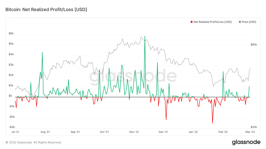 W celu ustalenia, czy uczestnicy rynku wychodzą z rynku podczas odbicia, analizowany jest wskaźnik Net Realized Profit/Loss. Wskaźnik ten mierzy zysk lub stratę netto wszystkich monet, które się poruszają. Spróbujemy ustalić, czy obecny wzrost to short squeeze.