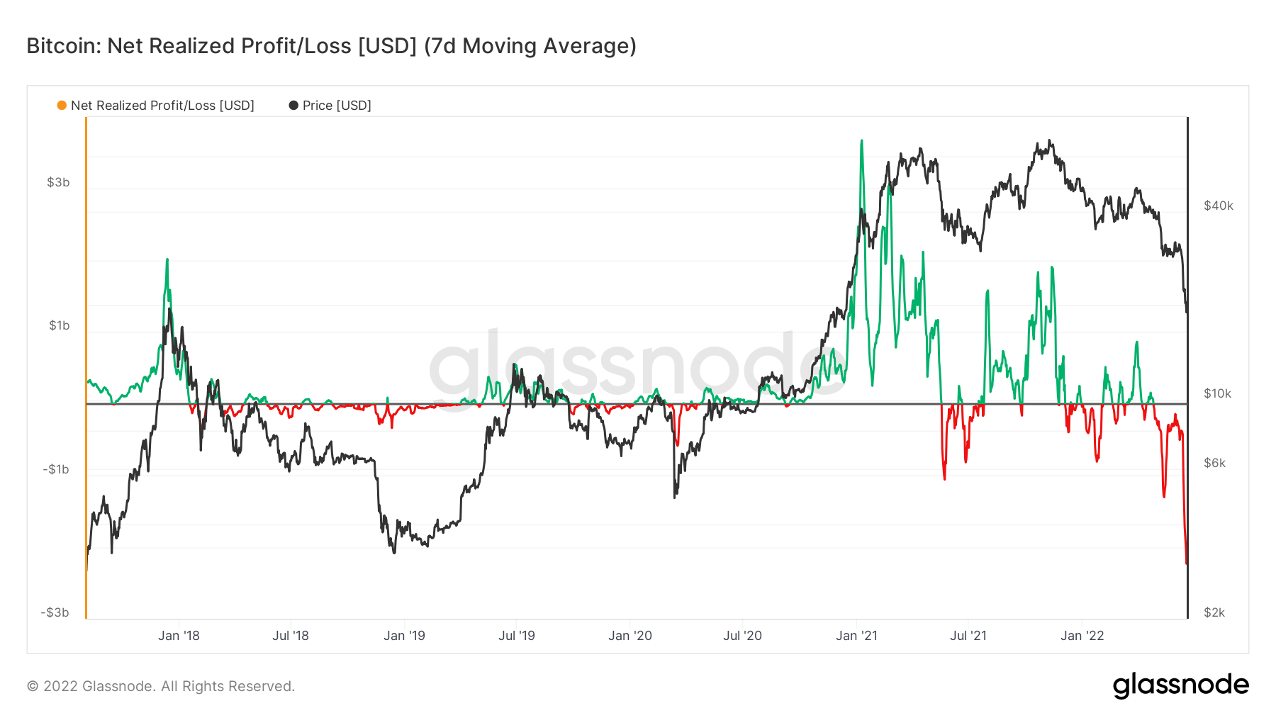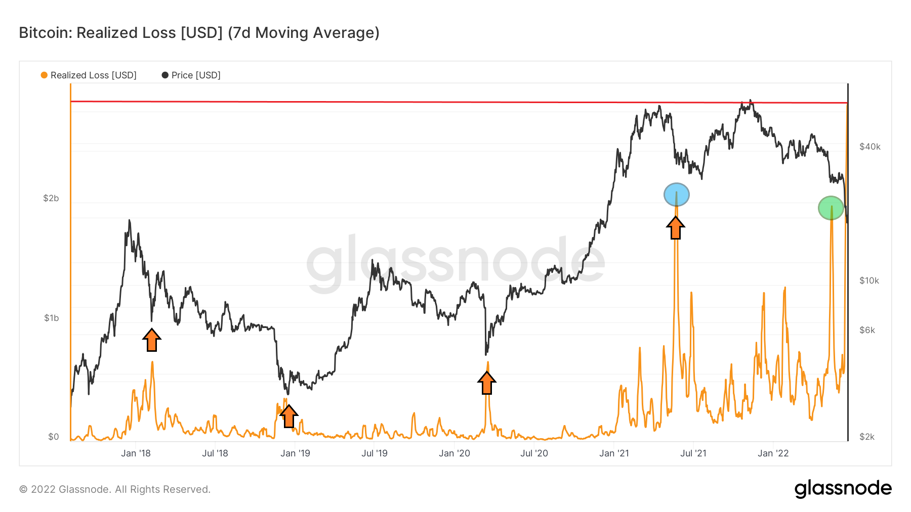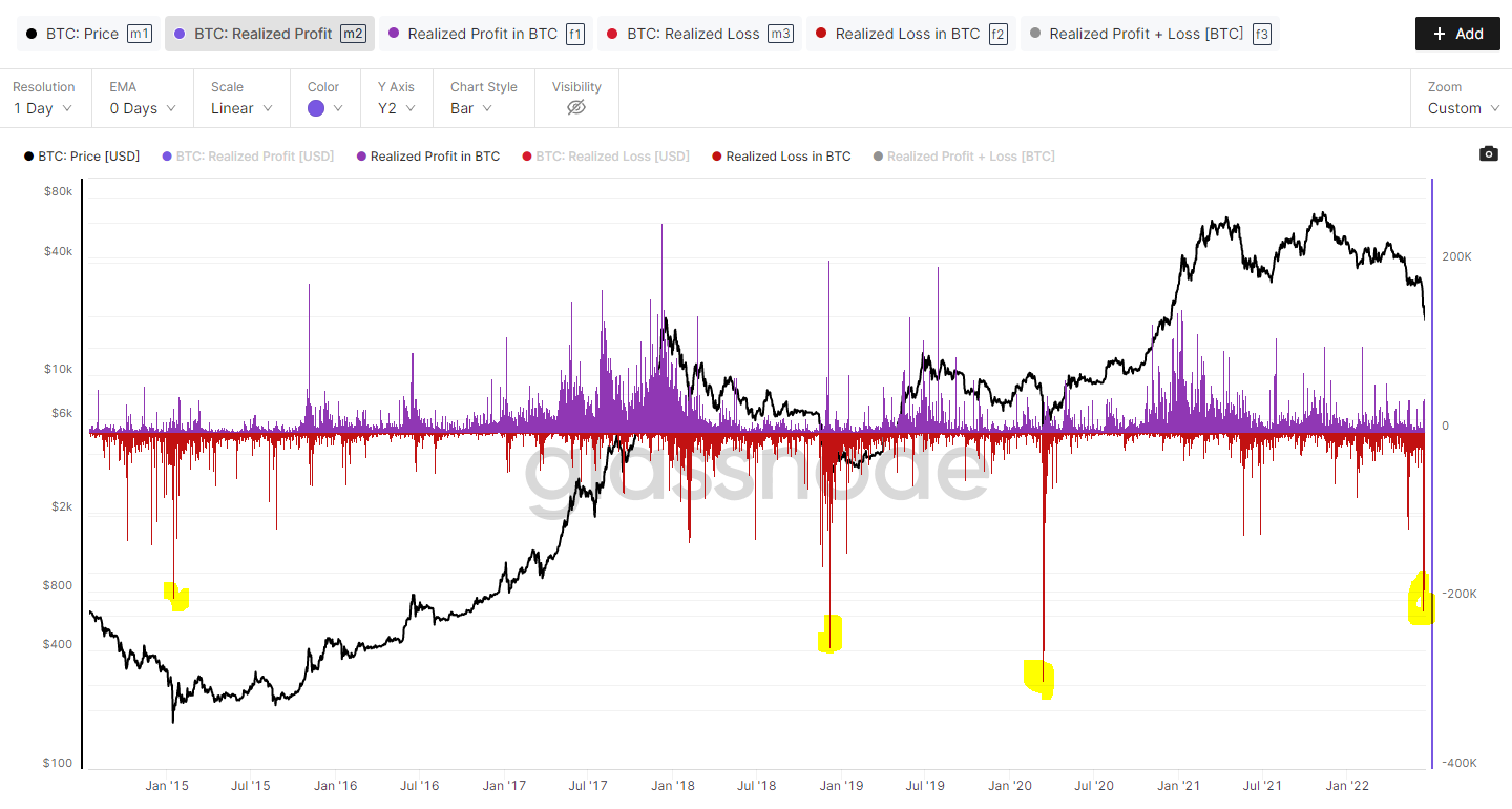 Są to rozmiary straty, mierzone w USD, których inwestorzy i traderzy Bitcoina nie doświadczyli nigdy w historii. Widać to dobrze na wykresie długoterminowym, w którym zrealizowaną stratę reprezentuje jej 7-dniowa średnia krocząca.