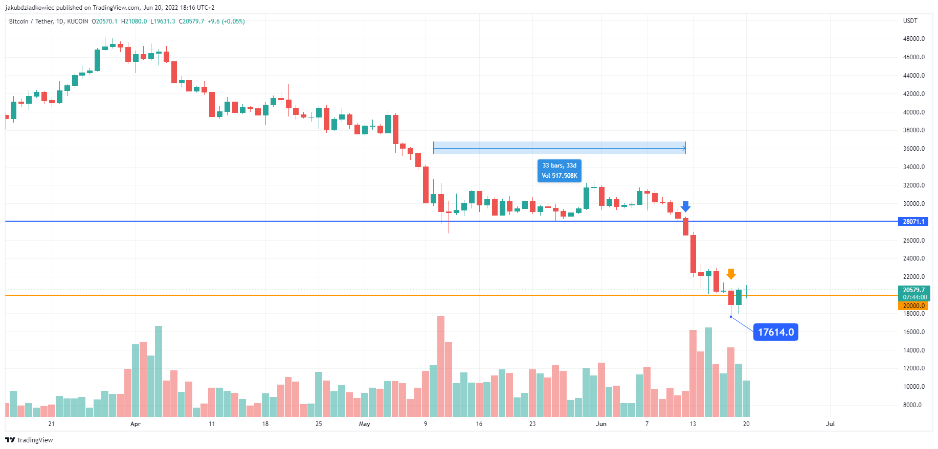 Natomiast później, w dniu 18 czerwca (pomarańczowa strzałka), nastąpił bezprecedensowy spadek Bitcoina poniżej szczytu poprzedniego cyklu z lat 2016-2017 na poziomie 20 000 USD.