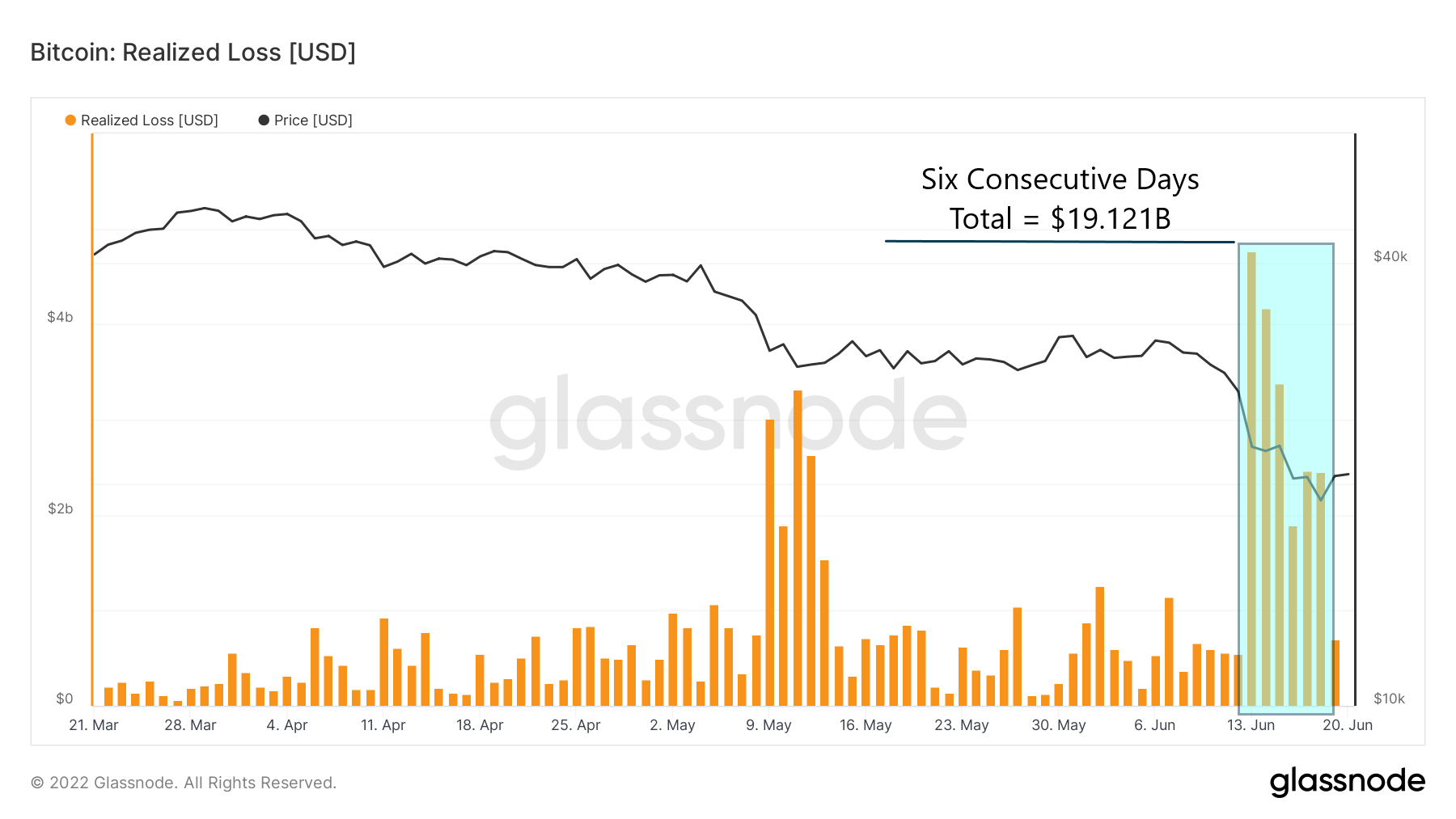 Opisana powyżej akcja cenowa z okresu 13-18 czerwca doprowadziła wskaźnik zrealizowanej straty do rekordowo wysokiego poziomu. Łączna strata, którą ponieśli inwestorzy, decydując się sprzedać swoje kupione przy wyższych cenach monety, wyniosła 19,121 mld USD za okres ostatnich 6 dni (błękitny obszar).