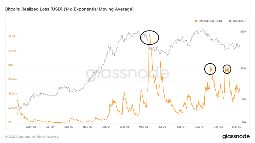 Zrealizowane straty osiągnęły następnie dwa szczyty (czarne kółka) w grudniu 2021 r. i styczniu 2022 r. Te dwa szczyty były bardzo podobne do siebie. Wtedy zrealizowane straty osiągnęły szczyty, które przypominały to, co zaobserwowano w lipcu 2021 roku.