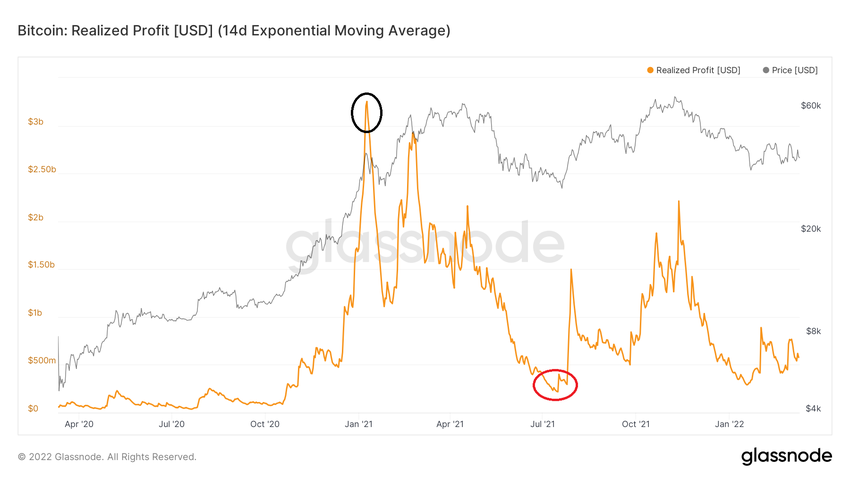 Zrealizowane zyski osiągnęły szczyt powyżej 3 mld USD w styczniu 2021 r. (czarne kółko), przy ówczesnej rekordowej cenie 40 400 USD. Następnie zrealizowane zyski osiągnęły najniższy poziom na 230 mln USD w lipcu 2021 r. Było to blisko lokalnego dołka cenowego BTC (czerwony okrąg).