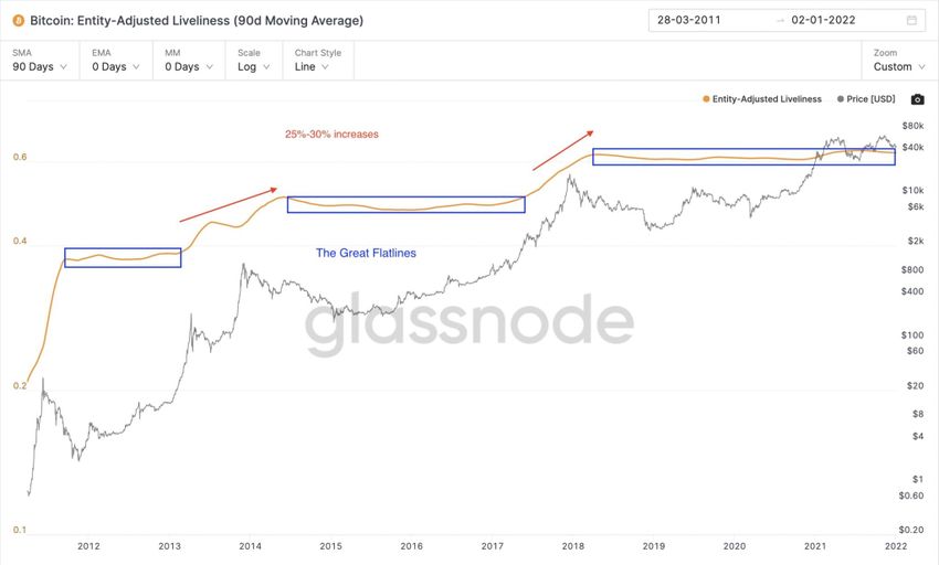 Analityk on-chain @kenoshaking zauważył interesującą zależność w okresach czasu, dla których żywotność jest względnie płaska.