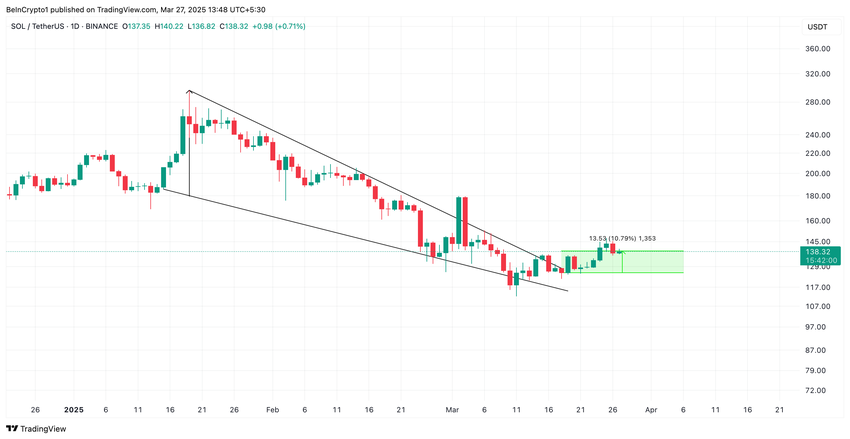 Tymczasem SOL zakończył swoje wybicie 19 marca i od tego czasu altcoin wzrósł o 10%. Gdy aktywo przebija się powyżej formacji spadającego klinu, jak w tym przypadku, oznacza to, że kupujący zyskują kontrolę.