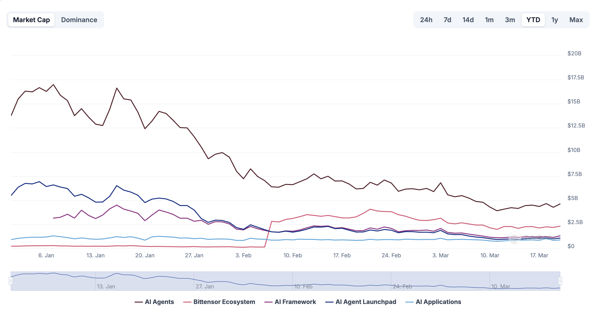 Główne katalizatory, które wcześniej wywoływały wzrosty, ostatnio nie zdołały wywołać tego samego impetu. Przykładem jest spadek kapitalizacji rynku monet AI po konferencji GTC firmy Nvidia.