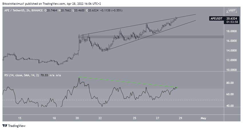 Wykres dwugodzinny pokazuje, że Apecoin od 20 kwietnia handluje wewnątrz klina zwyżkującego. Klin jest uważany za niedźwiedzią formację, co oznacza, że wybicie z niego byłoby najbardziej prawdopodobnym scenariuszem.