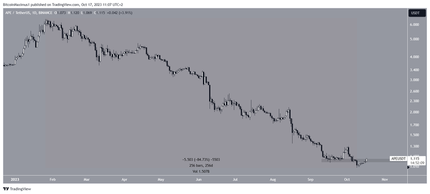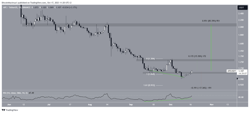 W dniu 9 października cena APE osiągnęła nowy ATL na poziomie 0,99 USD. Chociaż spowodowało to załamanie z horyzontalnego obszaru wsparcia na 1,10 USD, cena wzrosła od tego czasu i jest w trakcie odzyskiwania tego obszaru.