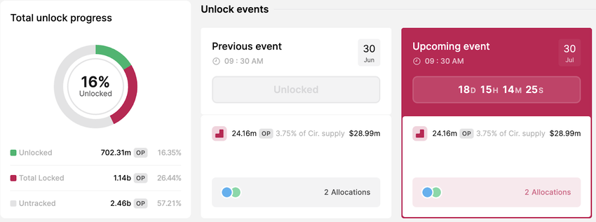 Wreszcie, 30 lipca Optimism (OP) odblokuje 24,16 miliona tokenów dla swoich głównych współpracowników i inwestorów. Tokeny stanowią 3,75% podaży w obiegu, a przy obecnej cenie są warte prawie 29 milionów dolarów.