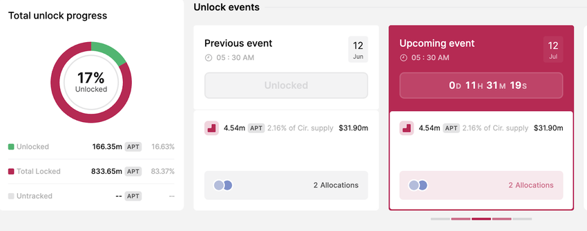 Aptos wprowadzi do obiegu 4,54 miliona tokenów o wartości ponad 31 milionów dolarów. Token stanowi 2,16% podaży obiegu.