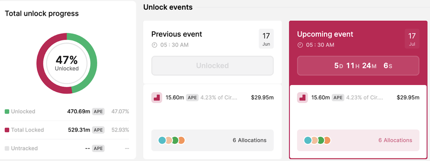 Następnie 17 lipca ApeCoin (APE) wprowadzi do obiegu 15,60 mln tokenów. Tokeny APE o wartości 29,95 mln USD stanowią aż 4,23% podaży w obiegu