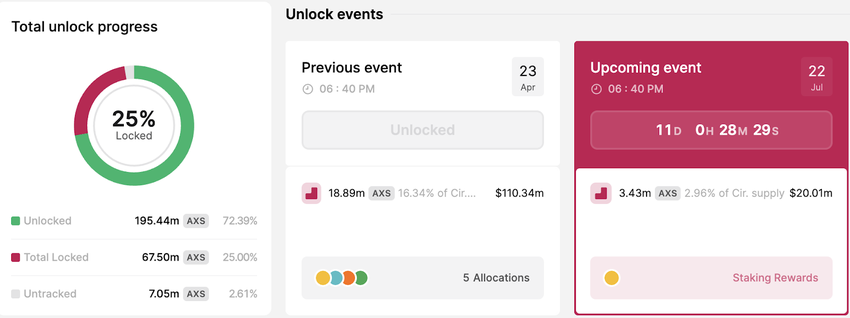 Axie Infinity zaplanowała odblokowanie tokenów AXS na 22 lipca, kiedy projekt wyda 3,43 miliona tokenów jako nagrody za staking. Tokeny , warte około 20 milionów dolarów w momencie publikacji, będą stanowić 2,96% podaży w obiegu.