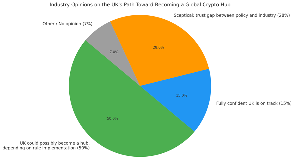 Nadal jednak istnieją wyzwania. Ankieta wśród 150 profesjonalistów z branży kryptowalut i finansów wykazała, że tylko 15% uważa, że UK jest na właściwej drodze.