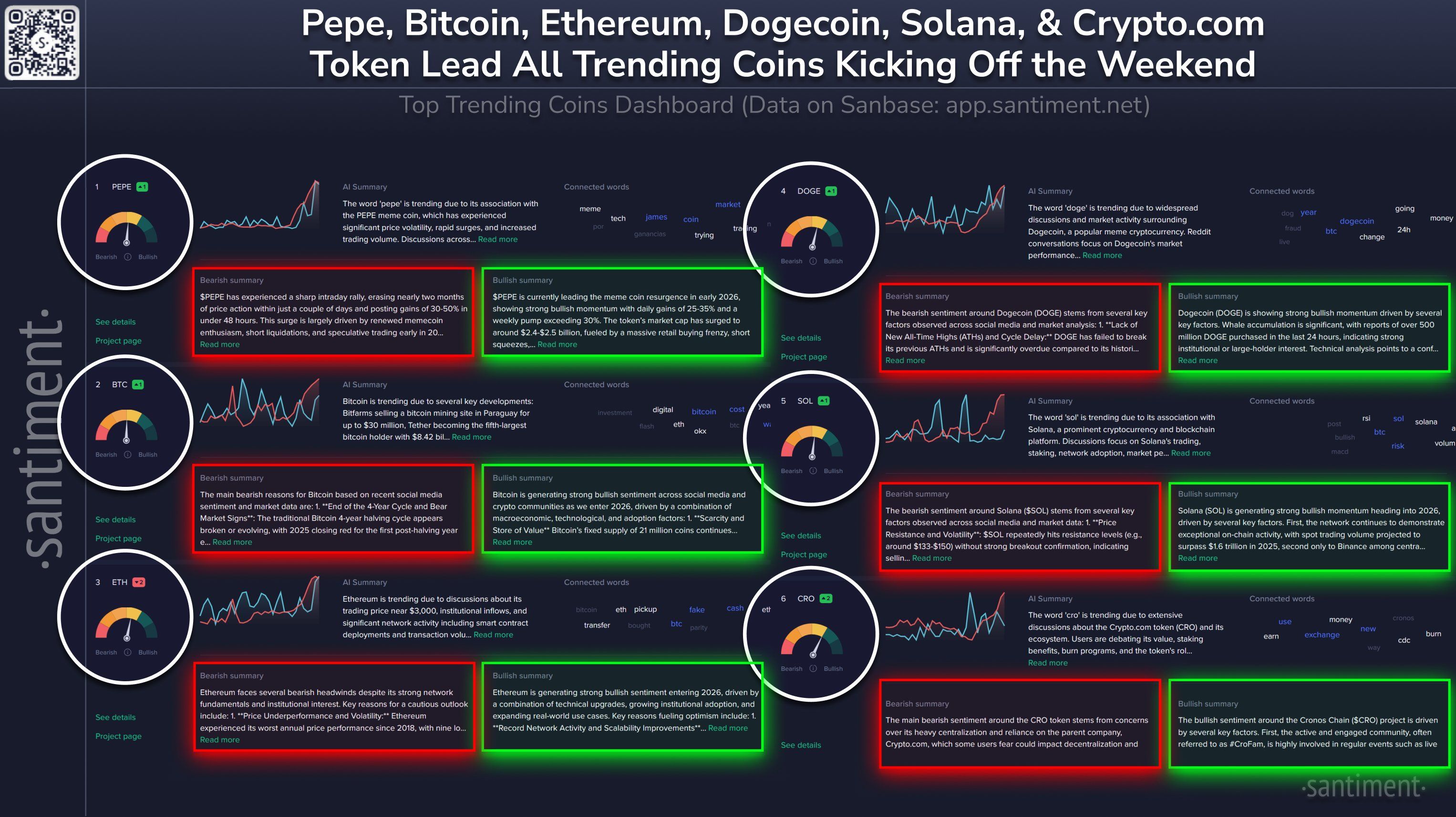 Zespół Santiment przeanalizował aktywność użytkowników w mediach społecznościowych. Wskazał projekty generujące największe zainteresowanie na starcie weekendu. Na pierwszym miejscu znalazł się Pepe (PEPE). Memecoin przyciąga uwagę przez silną zmienność i rosnące wolumeny. W dyskusjach dominują wątki zakupów detalicznych, short squeeze oraz porównań do DOGE czy SHIB. We wpisie Santiment czytamy o PEPE: