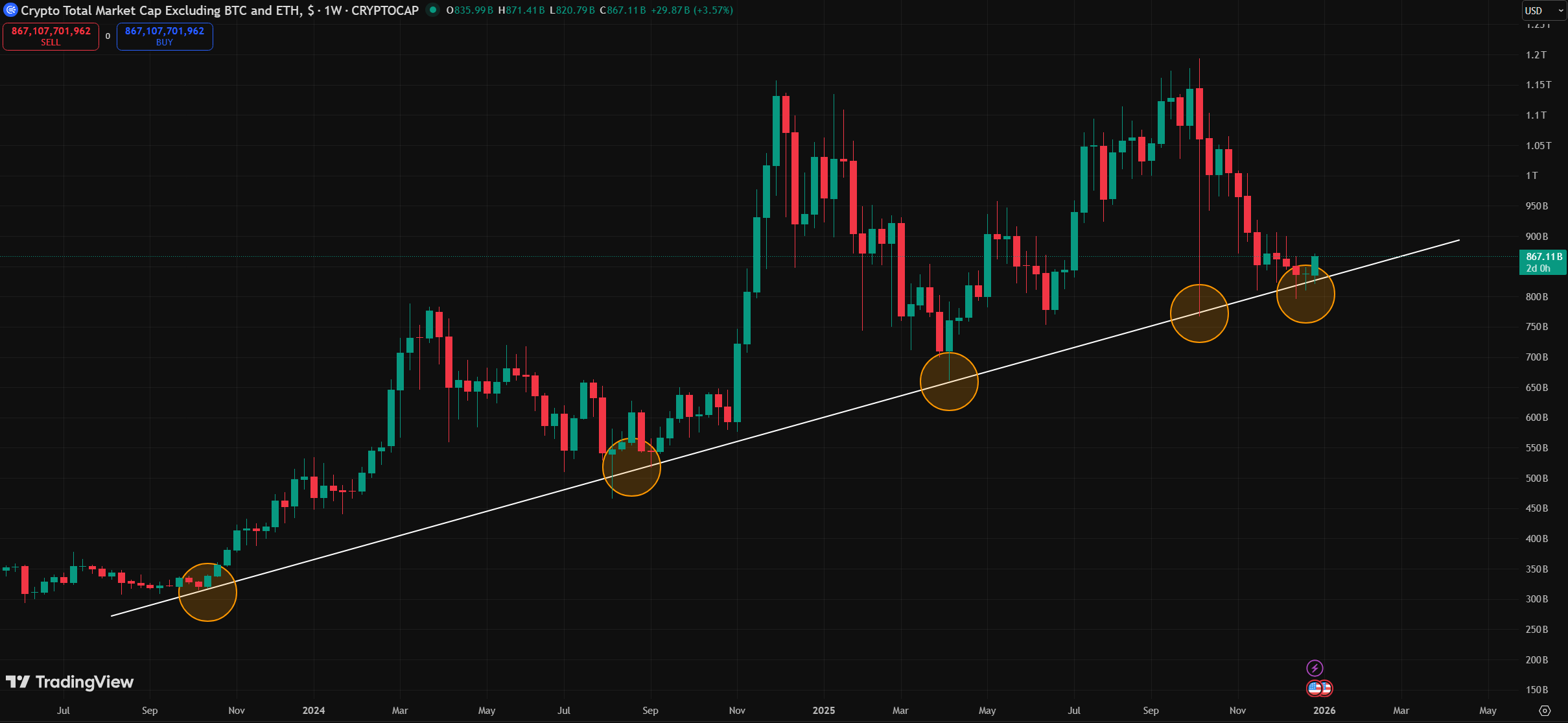 Znany obserwator rynku BlockNews wskazał na kluczowy poziom techniczny. Altcoiny odbiły się od długoterminowej linii trendu, która obowiązuje od 2023 roku. Według jego obserwacji, każde wcześniejsze dotknięcie tego poziomu prowadziło do średnich wzrostów rzędu 100%.