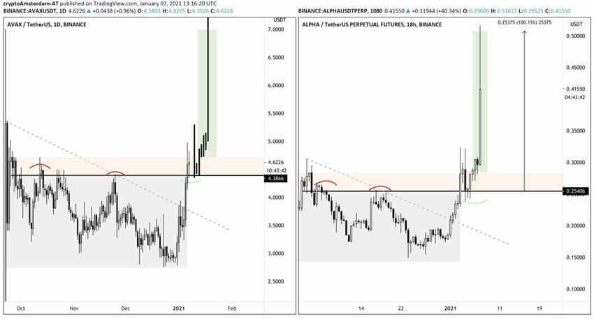 Trader kryptowalutowy @Damskotrades nakreślił podobną formację na wykresie ALPHA, która pokazuje trwające wybicie. Stwierdził on, że Avalanche może wkrótce wykonać ten sam rodzaj ruchu.