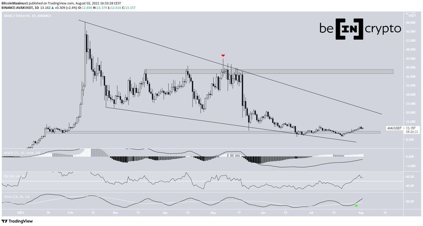 Avalanche (AVAX) notowany jest wewnątrz długoterminowego klina zniżkującego i odzyskał wsparcie horyzontalne na poziomie 11,50 USD.