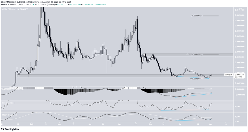 Wykres AVAX/BTC pokazuje notowania wewnątrz obszaru horyzontalnego wsparcia na 32 500 satoshi.