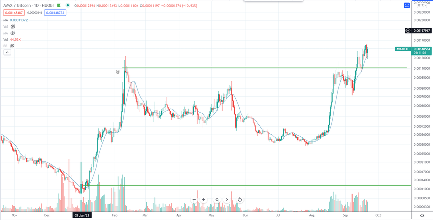 Trader kryptowalutowy @BobLoukas nakreślił wykres AVAX/BTC, stwierdzając, że para wykazuje znaczną siłę.