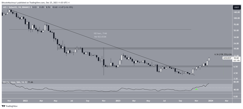 Cena AXS wzrosła od października, kiedy to przebiła długoterminową opadającą linię trendu oporu. Przed wybiciem linia trendu utrzymywała się przez ponad 700 dni, a konkretnie od rekordu wszech czasów (ATH) z listopada 2021 roku.
