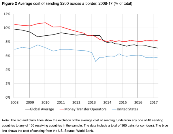 Remittance to czynność polegająca na wysyłaniu pieniędzy za granicę. Zazwyczaj płatności te są wysyłane przez zagranicznych pracowników do ich krajów ojczystych w celu zapewnienia środków finansowych członkom ich rodzin. Problem polega jednak na tym, że wysyłanie pieniędzy w tradycyjny sposób często dosyć długo i jest kosztowne – wystarczy spojrzeć na poniższy wykres [Stephen Cecchetti, Kim Schoenholtz].