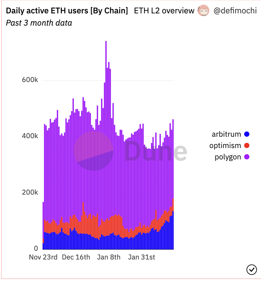 Według Dune, Polygon miał w środę 282,049 aktywnych użytkowników, a Arbitrum 135 483 użytkowników. Natomiast Optimism, partner Base, miał zaledwie 44 824 użytkowników.