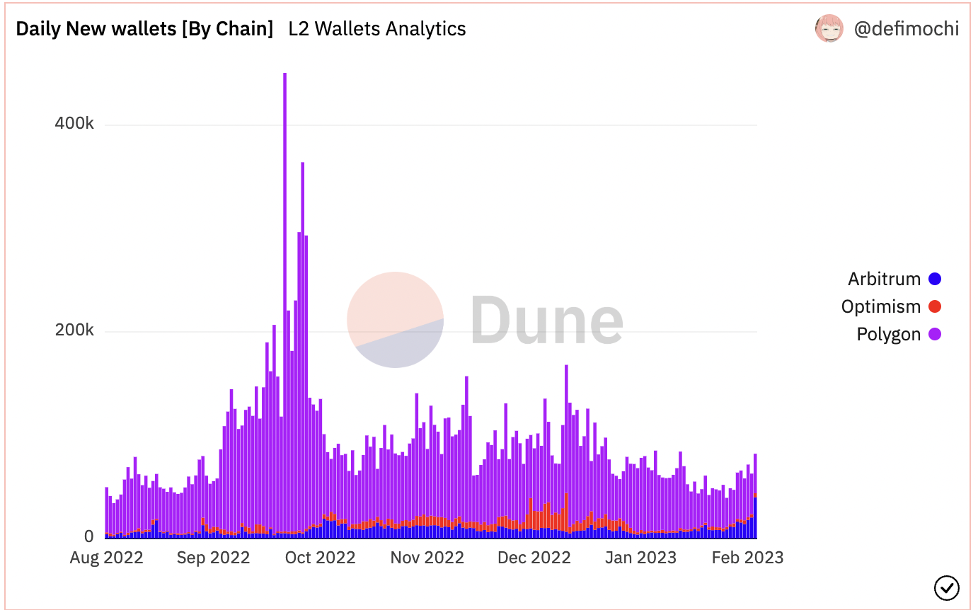 Jeśli chodzi o nowych użytkowników, to Optimism zaobserwowało w środę 3 984 nowych portfeli. Natomiast Polygon i Arbitrum uruchomiły ich prawie 10 razy więcej, odpowiednio 38 221 i 39 839.