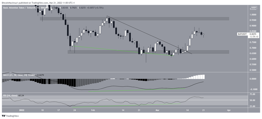 Basic Attention Token (BAT) wzrasta od 24 lutego i w dniu 14 marca przełamał swoją główną linię oporu. Wzrost poprzedzony był byczymi sygnałami zarówno na wskaźniku RSI jak i MACD.