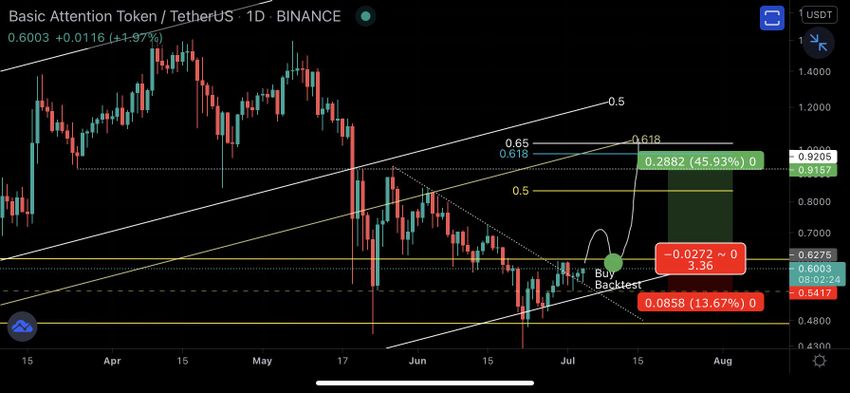 Trader kryptowalut @Mesawine1 przedstawił wykres BAT, stwierdzając, że ponowny test poziomu 0,60 USD byłby dobrą okazją do wejścia.