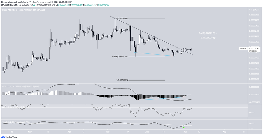 Po utworzeniu podwójnego dna w obszarze wsparcia 1440 satoshi (0,618 zniesienia Fib), BAT wyłonił się z opadającej linii oporu.