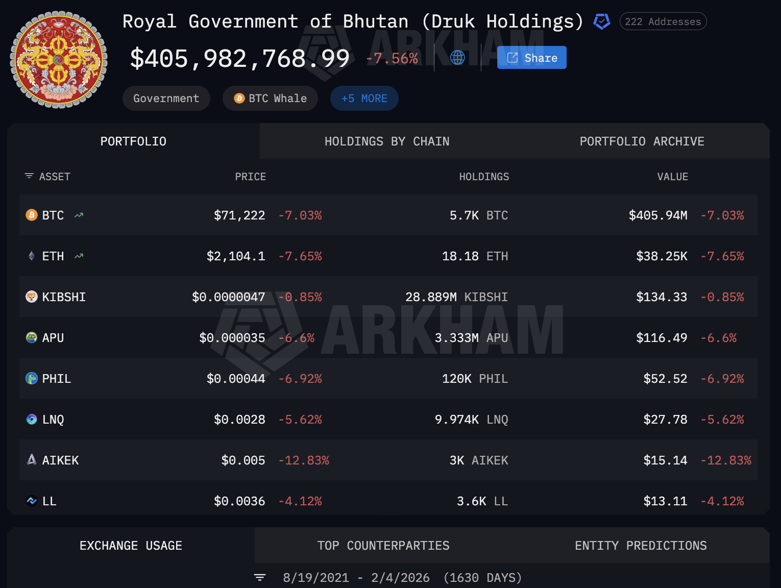 Portfel krypto Bhutanu znacząco się skurczył. Dane od Arkham Intelligence pokazują, że aktywa on-chain DHI to obecnie około 412 mln USD, podczas gdy szczyt portfela wynosił 1,4 mld USD. Ponadto, portfel składa się głównie z 5700 BTC, z niewielkimi udziałami w Ethereum i innych tokenach.