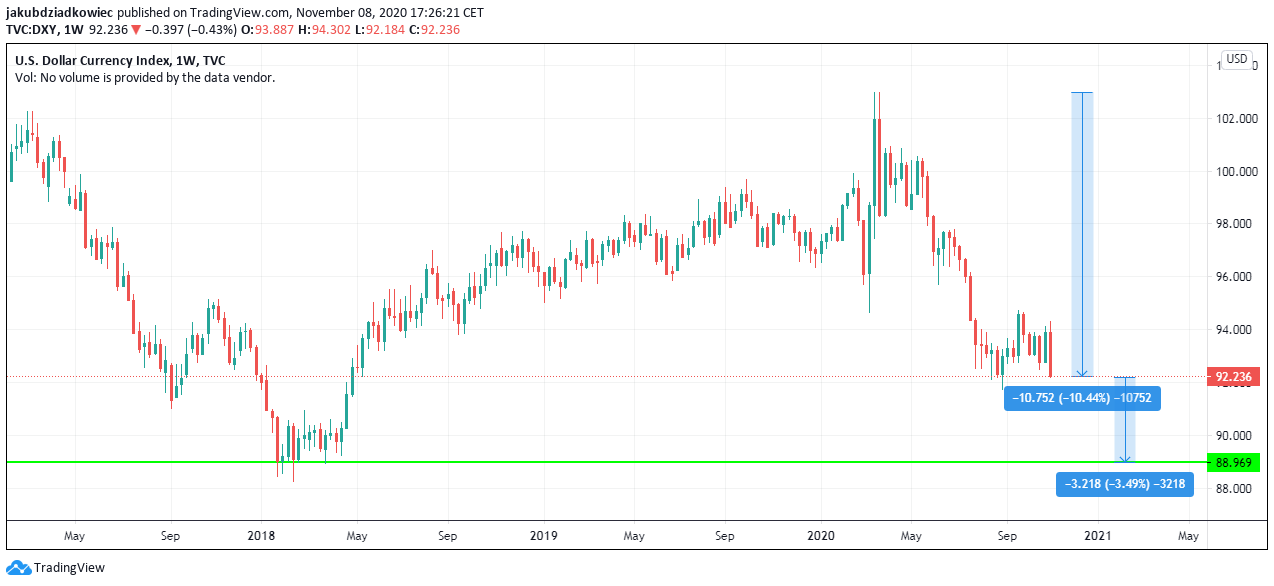 Jeżeli jednak spojrzeć na skutki poprzednich pakietów w USA oraz na perspektywę długoterminową, to rysuje się raczej niedźwiedzi scenariusz. Od marca 2020 dolar amerykański utracił ponad 10% swojej wartości. Najbliższy, duży obszar wsparcia sięgający dołka z 2018 roku znajduje się o kolejne 3,5% niżej. Dalej są jeszcze niższe obszary z lat 2007-2012.