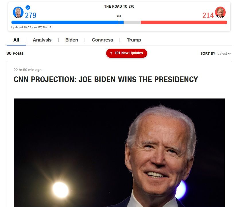 W dniu 7 listopada większość mediów w Stanach Zjednoczonych podała informację, że Joe Biden zdobył wymaganą liczbę 270 głosów elektorskich i będzie 46. prezydentem USA. Ogłoszenie jego zwycięstwa było już możliwe pomimo braku ostatecznych wyników z kilku stanów, w których jeszcze trwa liczenie głosów. Analitycy wyborczy twierdzą, że nawet, gdyby głosy zostały przeliczone jeszcze raz, a w kilku miejscach faktycznie zwycięzcą byłby Donald Trump, to nie zmieni to ostatecznego wyniku wyborów prezydenckich.