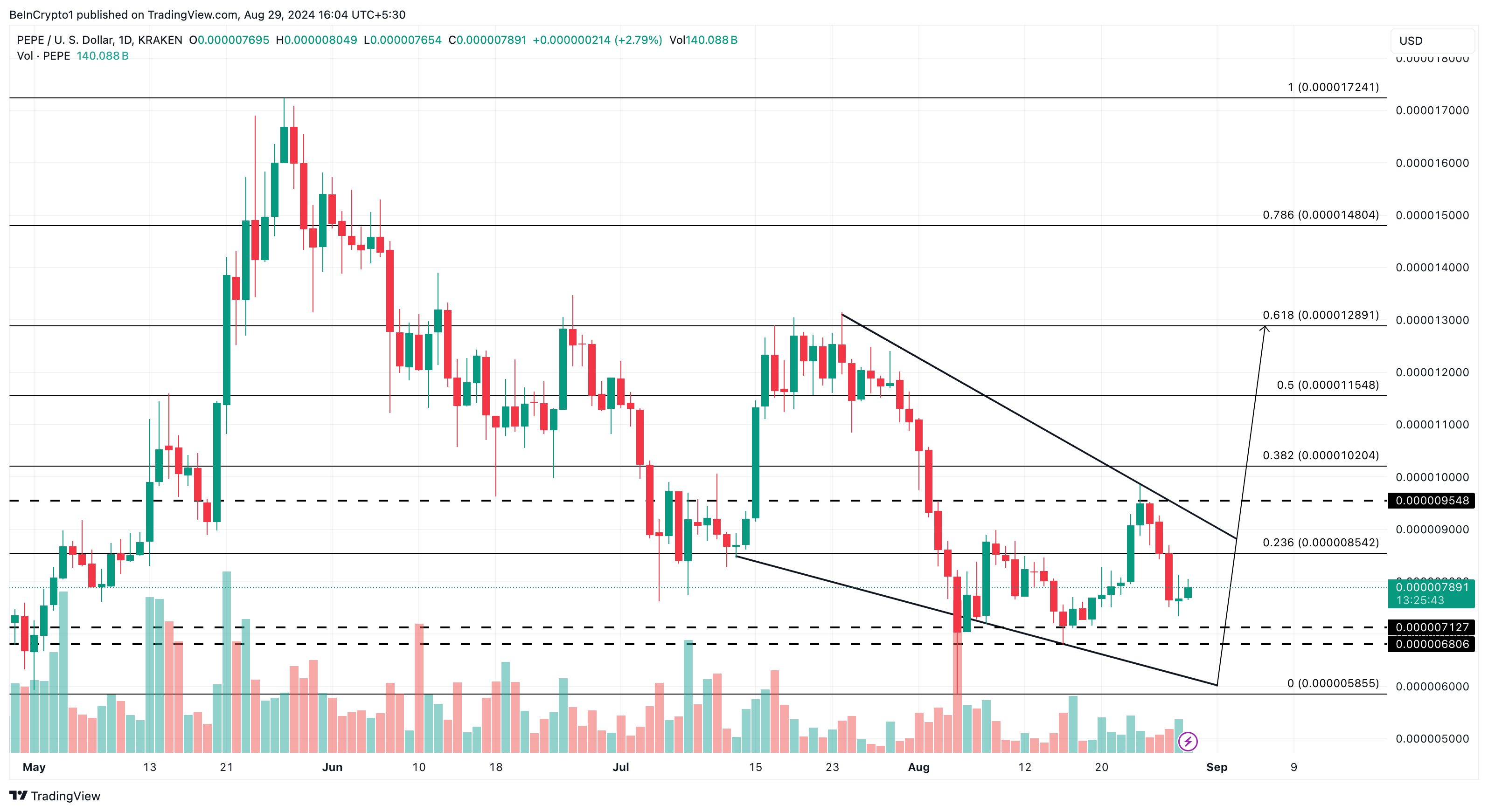 Aktualna cena PEPE wynosi 0,0000078 USD. Jednak według dziennego wykresu, token może osiągnąć wyższą wartość, gdy zbliża się nowy miesiąc. Poniższy obraz pokazuje formację zniżkującego klina.