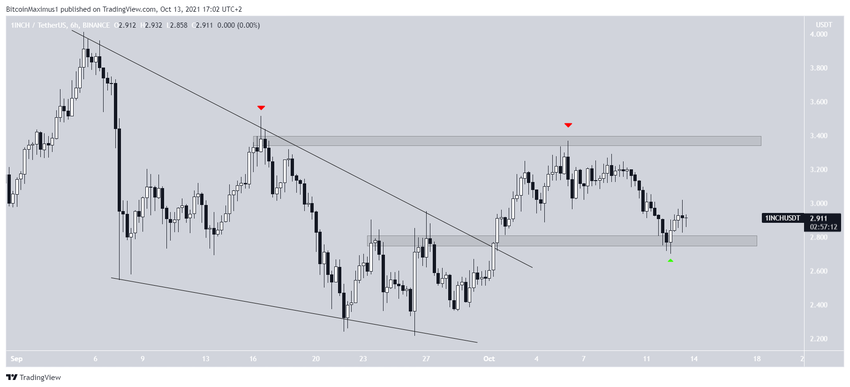 Nic dziwnego, że 1INCH wybił się w dniu 1 października i osiągnął szczyt na poziomie 3,37 USD (czerwona ikona). Następujące po tym odrzucenie posłużyło do potwierdzenia obszaru 3,37 USD jako oporu, ponieważ ten sam obszar działał jako szczyt w dniu 16 września.