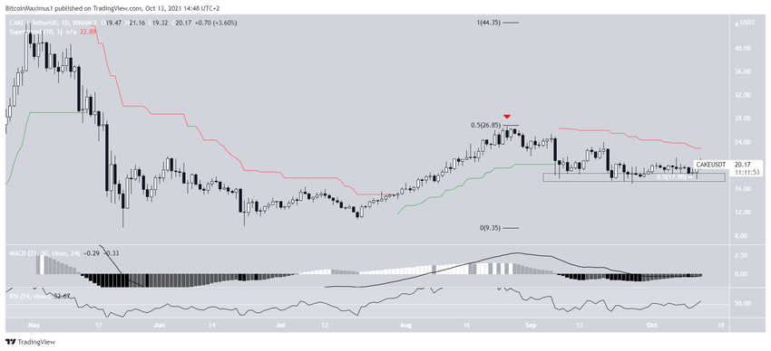 CAKE spada od dnia 25 sierpnia, kiedy to został odrzucony przez obszar oporu na 26,85 USD. Jest to poziom zniesienia 0,5 Fib i często działa jako opór po odbiciach.