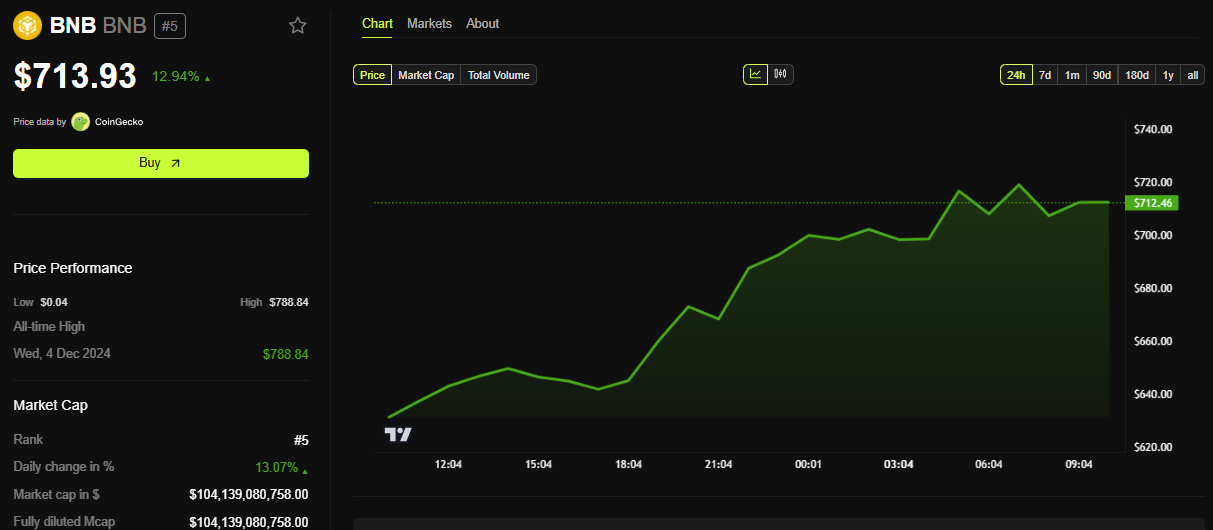 Dane BeInCrypto pokazują, że BNB jest wyceniany po 713,93 USD w momencie pisania, co oznacza prawie 13% wzrost w ciągu ostatnich 24 godzin.